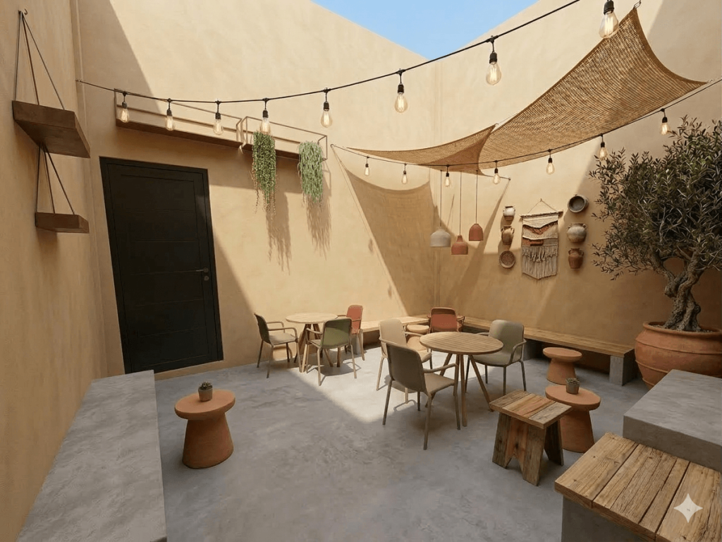Kamu juga bisa memanfaatkan area belakang ruko dengan menghadirkan konsep outdoor seperti ini, sehingga menciptakan suasana santai, estetik, dan nyaman. Area ini juga memberikan pengunjung lebih banyak pilihan tempat duduk.