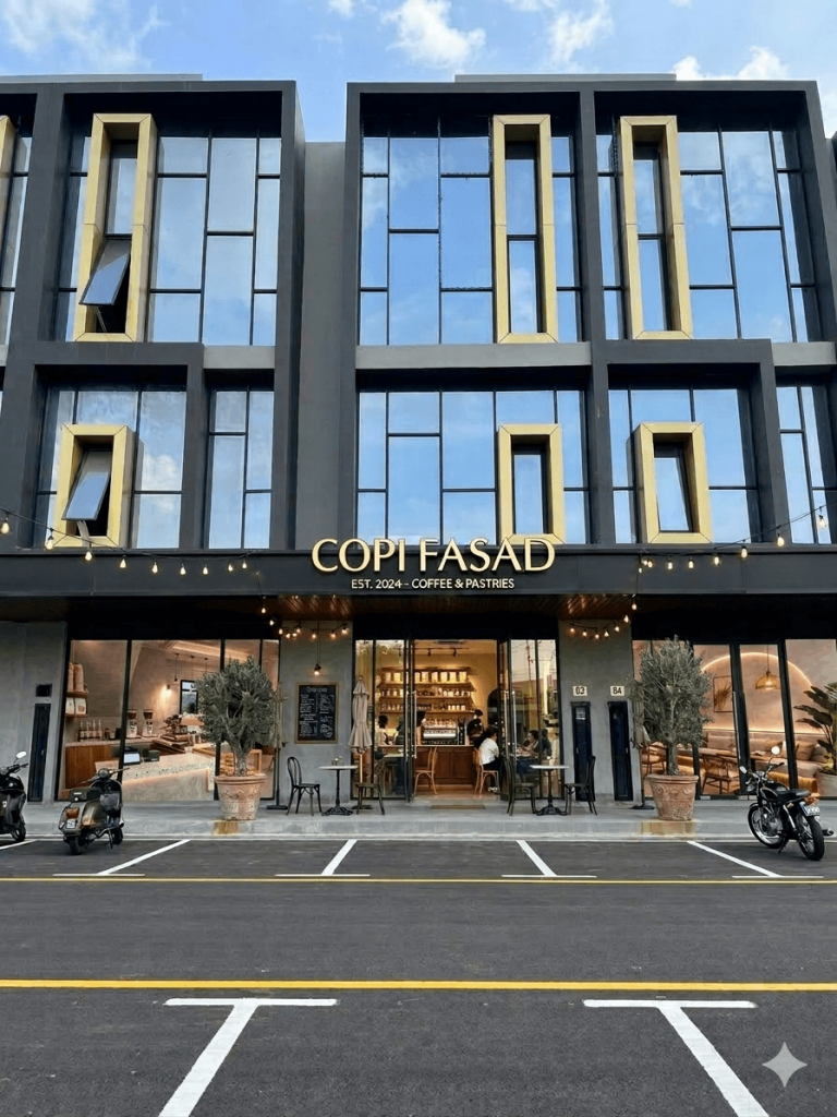 Desain ruko modern dengan konsep minimalis elegan yang digunakan sebagai coffee shop. Fasad didominasi kaca besar dengan aksen geometris dan warna gelap, menciptakan kesan premium dan menarik perhatian dari luar.