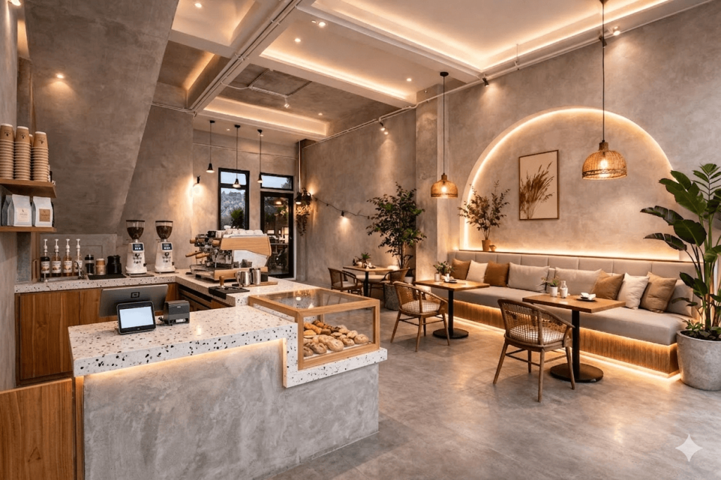 Dominasi material semen ekspos, kayu, serta pencahayaan warm menciptakan suasana hangat dan nyaman, sehingga cocok untuk bisnis coffee shop di ruko dengan tampilan premium dan estetik.